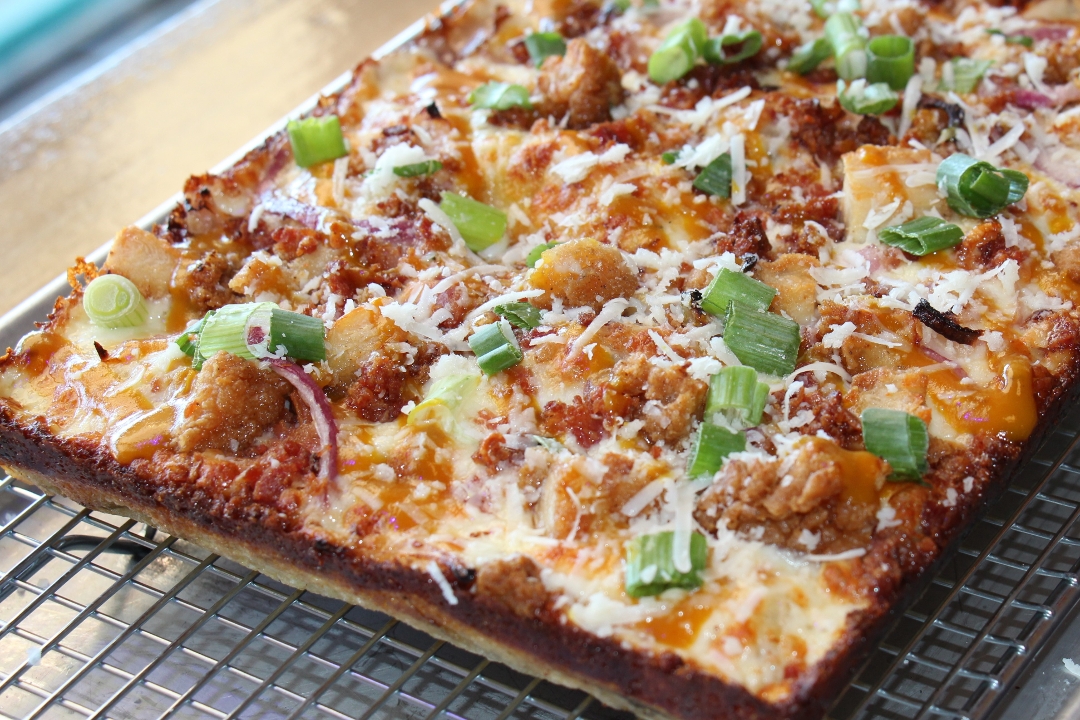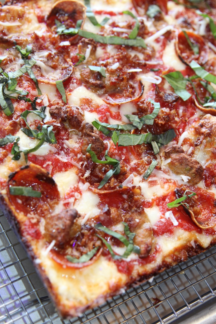 DETROIT RED SAUCE - BRICK CHEESE BLEND - SMOKED BACON - PINCHED SAUSAGE - EZZO CUP PEPPERONI - FRESH BASIL - PECORINO ROMANO