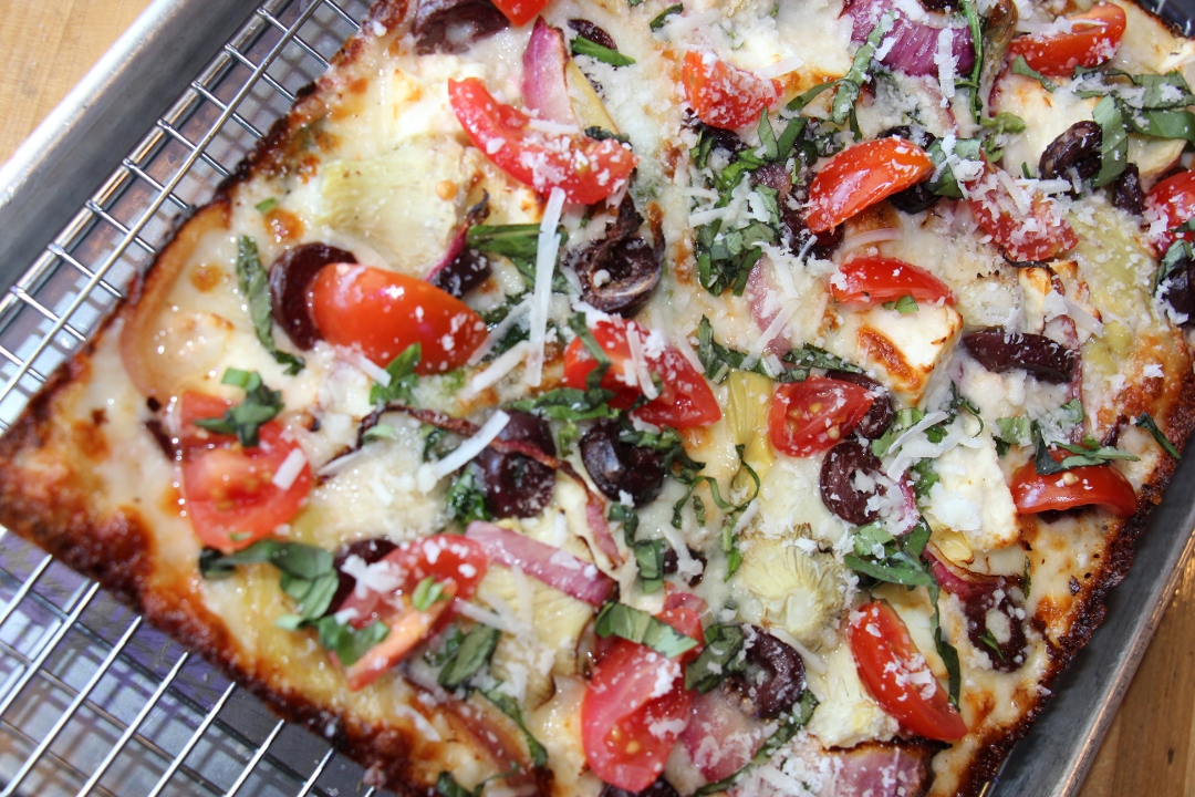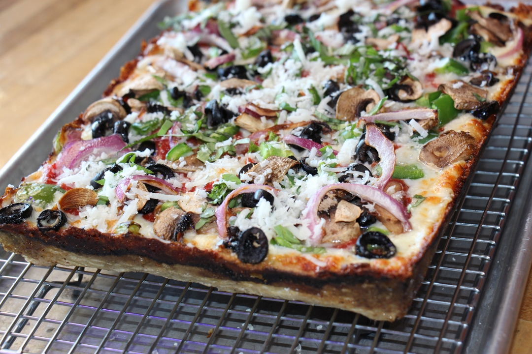 DETROIT RED SAUCE - BRICK CHEESE BLEND - GREEN PEPPER - BLACK OLIVES - MUSHROOMS - RED ONION - PECORINO ROMANO