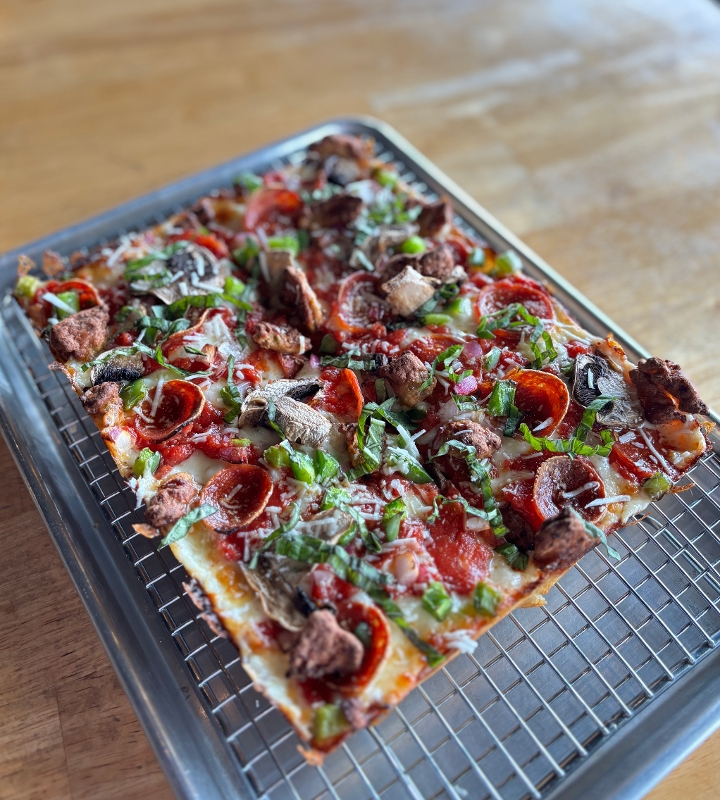 DETROIT RED SAUCE - BRICK CHEESE BLEND - EZZO CUP PEPPERONI - PINCHED SAUSAGE - MUSHROOMS - RED ONIONS - GREEN PEPPER - PECORINO ROMANO - BASIL