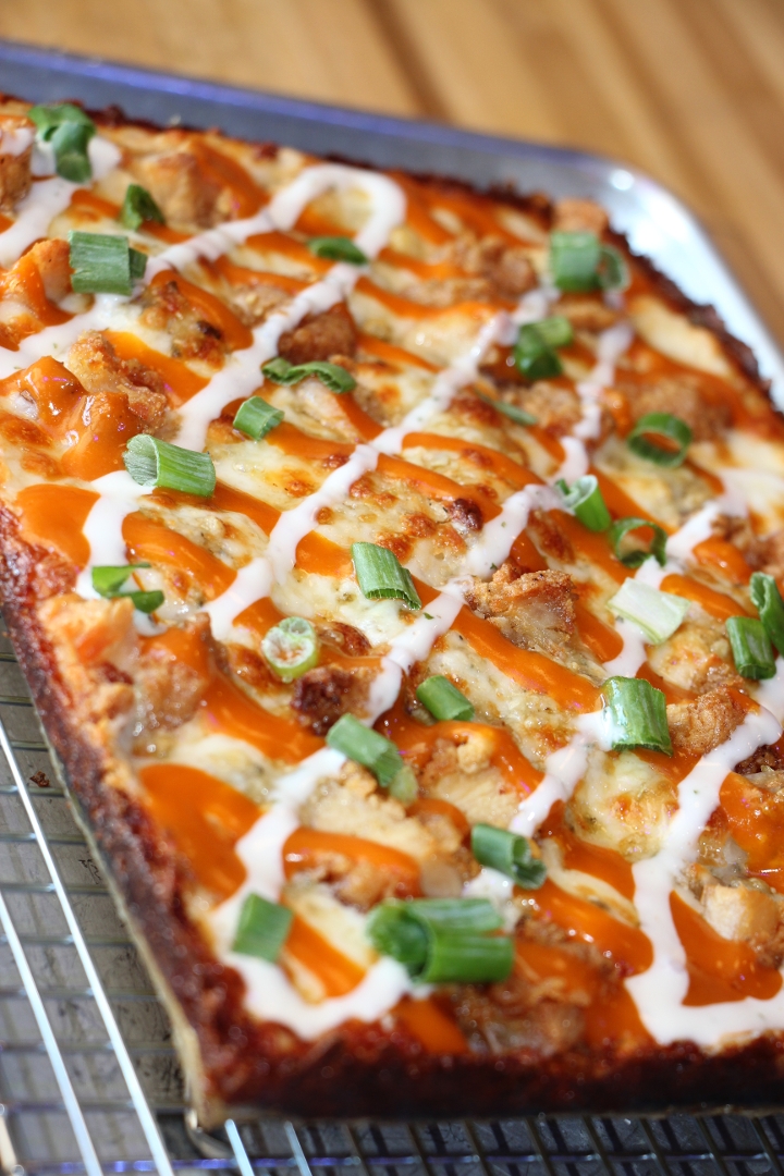 ALFREDO SAUCE - DICED CHICKEN TENDERS - BLUE CHEESE CRUMBLES - RANCH DRIZZLE - BUFFALO DRIZZLE - GREEN ONION