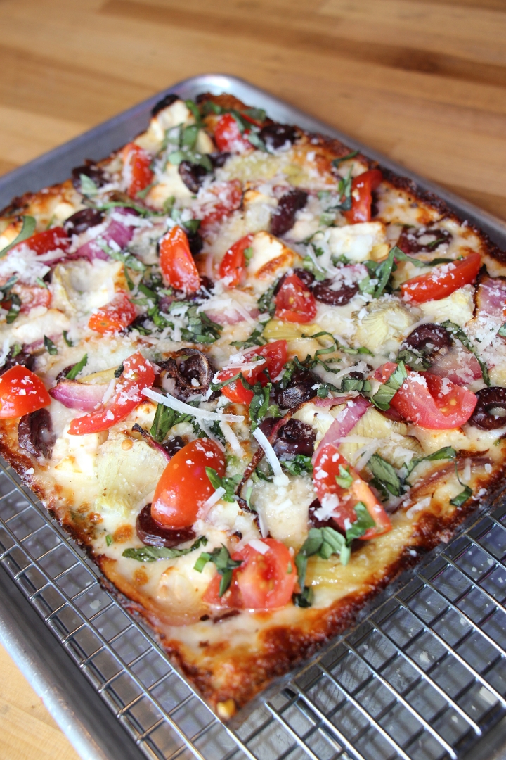 GARLIC OLIVE OIL - BRICK CHEESE BLEND - SPINACH - ARTICHOKE - DICED TOMATOES - FETA CHEESE - KALAMATA OLIVES - RED ONION - PECORINO ROMANO