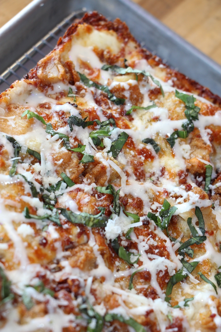 DETROIT RED SAUCE - BRICK CHEESE BLEND - PINCHED SAUSAGE - EZZO CUP PEPPERONI - WHIPPED RICOTTA - HOT HONEY - FRESH BASIL