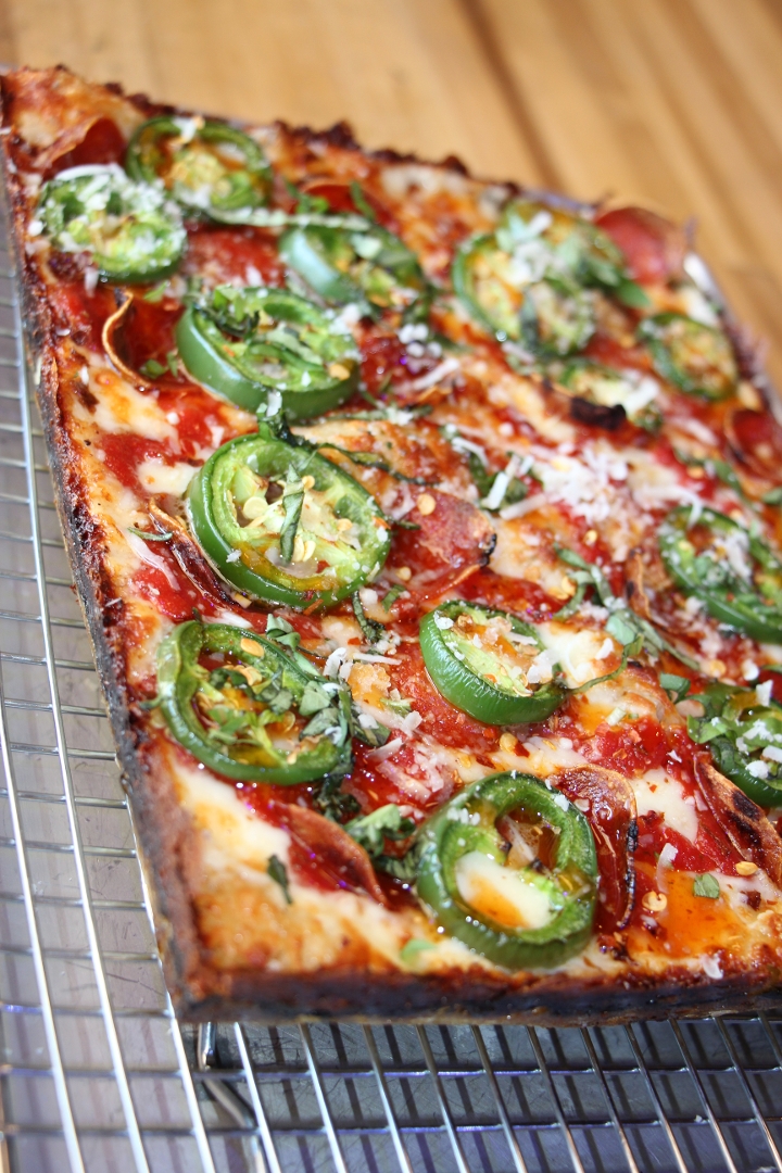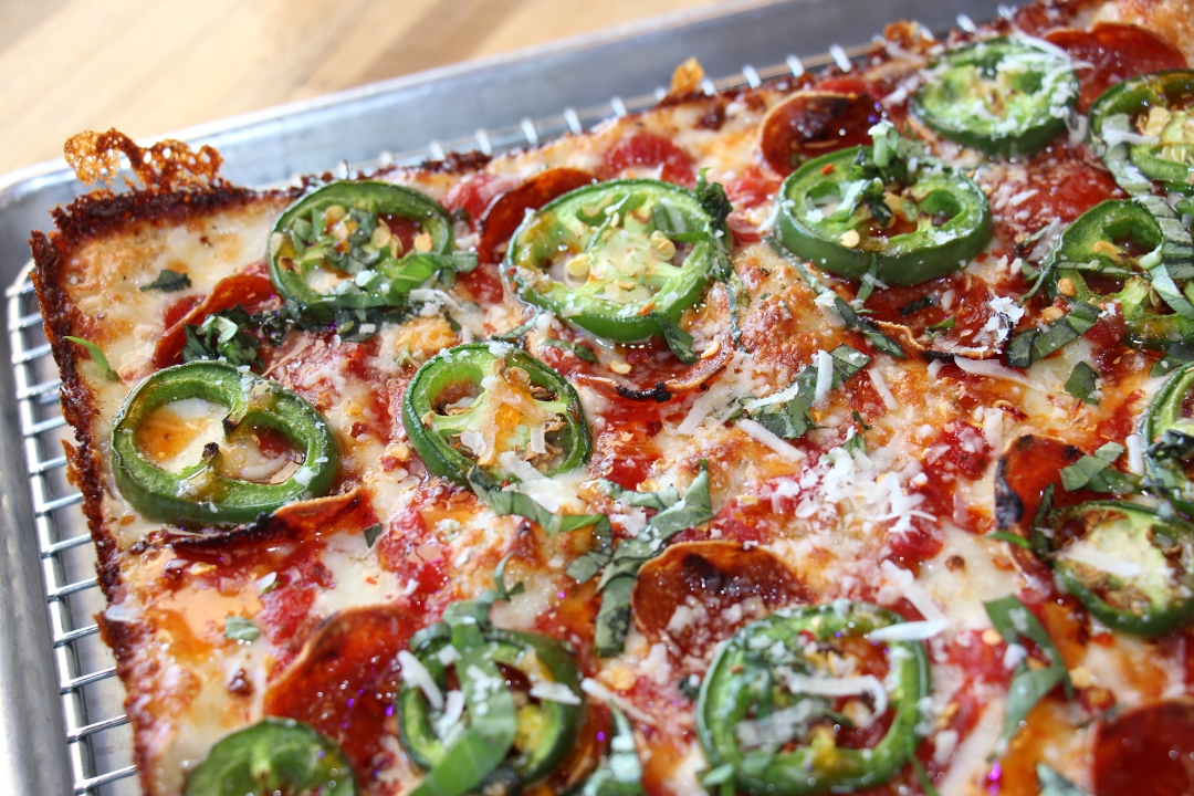 DETROIT RED SAUCE- BRICK CHEESE BLEND - EZZO CUP PEPPERONI - FRESH JALAPENO - CRUSHED RED PEPPER - HOT HONEY - PECORINO ROMANO -BASIL