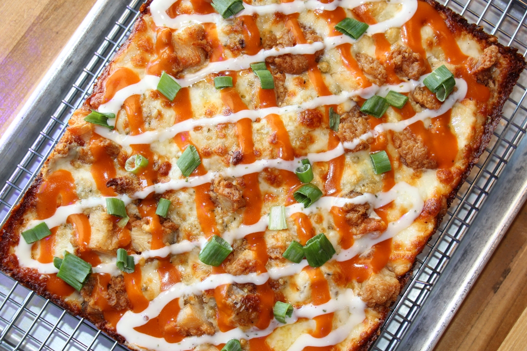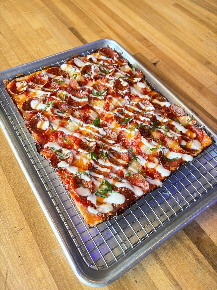 DETROIT RED SAUCE - BRICK CHEESE BLEND - DOUBLE EZZO CUP PEPPERONI - RANCH DRIZZLE - HOT HONEY DRIZZLE - PECORINO ROMANO – BASIL