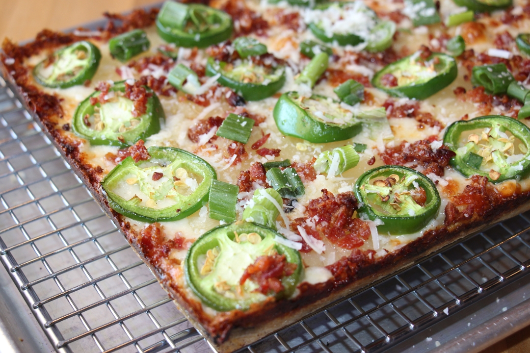 ALFREDO SAUCE - BRICK CHEESE BLEND - PINEAPPLE RINGS - SMOKED BACON - FRESH JALAPENO - GREEN ONION